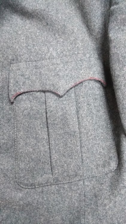 Będąc w temacie stylizacji, nie rekonstrukcji. Ostatnio dobrałem się do kolejnych elementów sylwetki i mogę przedstawić co z tego ulepiłem. Stylizacja zrobiona w większości po kosztach oraz z tego co miałem do Luftwaffe. Może zacznijmy od wyposażenia. Jak już Marek wspominał, CK używało brązowej skóry, więc jak ktoś się stylizuje w WW2 na wczesno-wojennego spadaka to będzie miał z górki. Pas główny, żabka do bagnetu i pokrowiec z łopatką to moje rzeczy na Fallschirmjägera, ale na biedaCK, pasują idealnie. Do żabki idzie oczywiście bezpieczna broń biała (Widoczna na zdjęciu pierwszym. Work in progress, proszę się nie śmiać :D) Jako, że CK używało ładownic dwukomorowych to uznałem, że ładownice do Mosina, na taką samą modłę, starczą (Niby zdobyczne). Oryginały kupione za parę dyszek. Chlebak i klamra to spoko reprodukcje z Nestofa. Czapka Erel z Nestofa, też dla FJ. Muszę do niej przyczepić jeszcze bączek i będzie dobra. Poniżej, najtrudniejszy element do wykonania, bluza. Na pierwszym zdjęciu jest baza, bluza szwajcarska, a na drugim wynik końcowy. 1. Kieszenie górne. Po pierwsze, klapy są zrobione z dwóch warstw wełny. Wierzchnią trzeba przyciąć na kształt klap CK, a dolną na mały język dla guzika kieszeni. W teorii, kieszenie nie miały kontrfałdy, ale ja przed poprzednią grą nie miałem czasu tego usunąć, więc tak zostało. 2. Kieszenie dolne. W klapach można przyciąć obie warstwy materiału tak samo i je zszyć ze sobą, do tego trzeba odpruć całą kieszeń, zrobić otwór pod klapą i zszyć wełnę z podszywką lnianą, aby wykonać kieszeń wewnętrzną. Szew tylko z góry i jednej strony, bo pozostałe dwie są już zszyte fabrycznie. 3. Z materiału dolnych kieszeni można wykonać naramienniki i wałek, na którym trzymał się pas nośny karabinu. 4. W znacznej większości bluz CK, guziki na klapie były schowane. Dlatego też zaszyłem otwory na nie, tylko na warstwie wierzchniej, tak żeby guziki wchodziły między dwie warstwy. 5. Rękawy miały ściągacze, więc je uciąłem, aby były proste i zrobiłem nowe otwory na guziki. 6. Błękitne paski na kołnierzu to obszycia jednostki, tak jak podawał Marek. Guziki kalesonowe z czterema otworami i oraz te mosiężne można kupić po taniości na Allegro. Niestety nie udało mi się znaleźć nitki pod kolor, więc ją trochę widać, ale jak na parę godzin roboty w przeddzień gry i pierwszą taką poważną przeróbkę to moim zdaniem wyszło nieźle. Szkoda, że nie wyzdrowiałem na tyle, aby wziąć udział. Spodnie kupiłem do kompletu, ale nic w nich nie przerabiałem, chyba nie ma sensu. Buty to moje stare 'Szwedki'. Brązowe, skórzane i za kostkę, czyli na stylizację pasują. Do kompletu brakuje mi tylko owijaczy, ale to się ogarnie. Karabin to oczywiście mój customowy Kar98k. Może kiedyś jakaś firma zrobi Mannlichera, albo uda się customa machnąć. -