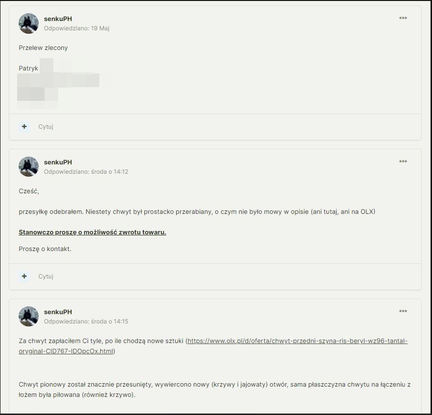 Sprzedającego poinformowałem o tym, co zastałem w paczce. Wnioskowałem o zwrot pieniędzy z tytułu znaczącej wady, nieuwzględnionej zarówno w opisie, jak i w konwersacji.