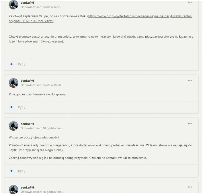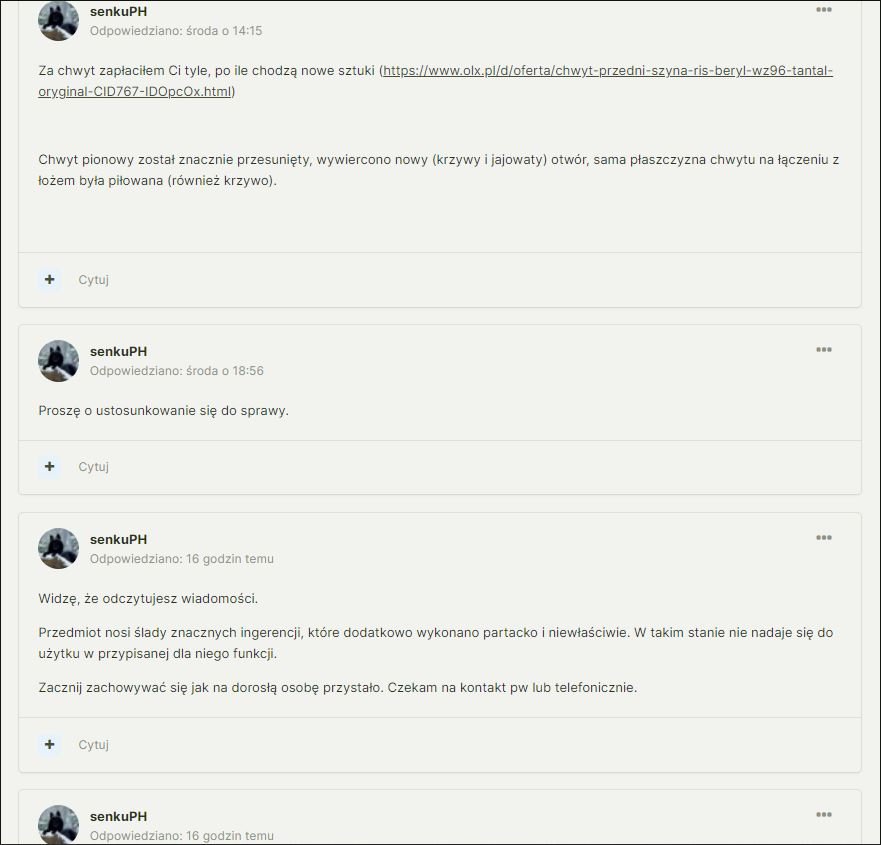 Kilka dni temu zakupiłem u niego chwyt do beryla. Przesyłkę otrzymałem, jednak sam przedmiot był nieudolnie, niechlujnie przerabiany (pionowy chwyt został przesunięty do tyłu, wywiercony został dodatkowy, jajowaty krater, bo dziurą ciężko to nazwać, a sam chwyt był piłowany chyba w pokoju bez żarówki i okien). Łoże nie nadaje się do niczego, a sam chwyt się kolibie i jest przesunięty względem osi łoża. Opis przedmiotu nie zawierał ani słowa a wprowadzonych "przeróbkach" (a raczej nieodwracalnych uszkodzeniach). Za chwyt zapłaciłem 210zł z wysyłką. Jest to cena nowych/magazynowych egzemplarzy oferowanych na znanym portalu aukcyjnym. Jak bezczelnym trzeba być, by mimo znaczących wad wystawiać swój przedmiot w cenie artykułów bez defektów?