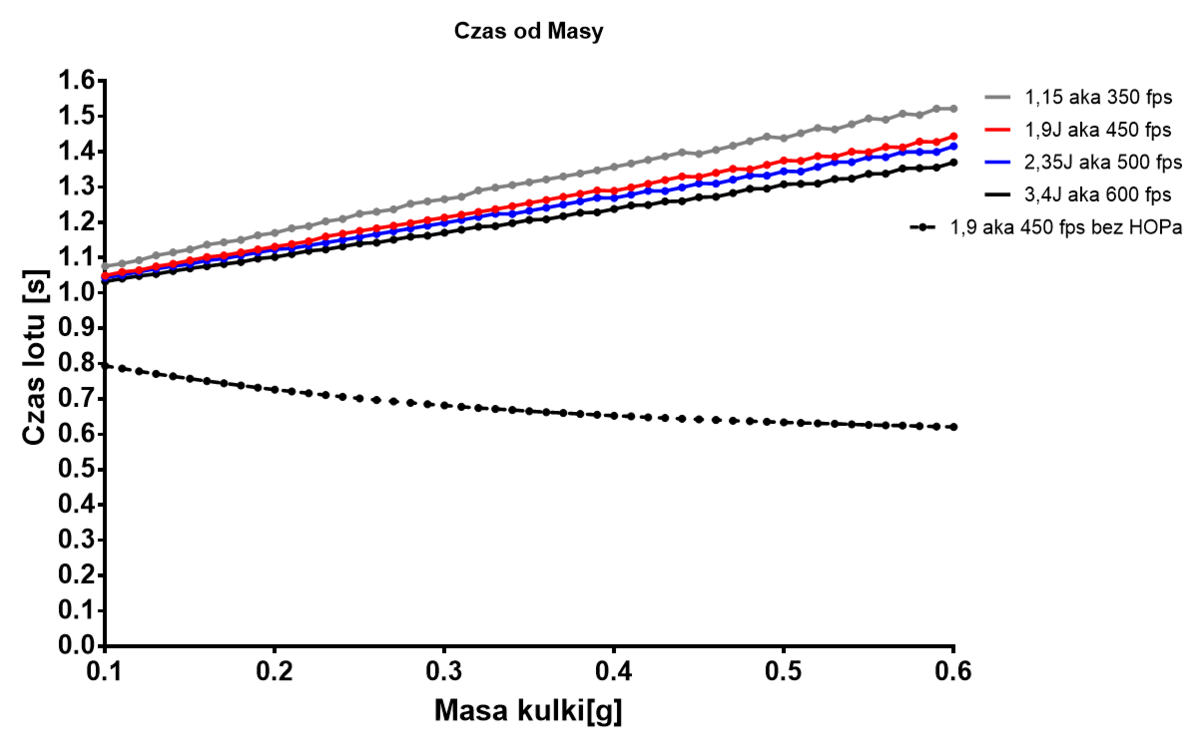 By być dokładnym program, to tak naprawdę skrypt w Matlabie. Jeśli więc masz Matlaba mogę podesłać, (jak odpowiednio "przeczyszczę" program, by można go było pokazać innym). W teorii skrypt chodzi także na darmowym środowisko Octave, ale nie testuje go na nim, więc nie mogę dać gwarancji, że jakieś błędy się nie pojawią. Co do współczynnika oporu, to tak daje jego wartość uśredniona. Z jednej strony, oznacza to iż dokładne zasięgi, trochę będą się różniły od "rzeczywistej" sytuacji, z drugiej strony z moich testów wynika, iż różnice nie są jakieś specjalnie wielkie, a to o co mi najbardziej chodziło (wzrosty zasięgów) są liczone w praktyce dobrze. Co do czasu lotu w zależności od masy, to mi wychodzą takie wyniki Więc tak, duża zmiana masy kulki, powoduje niewielki przyrost czasu kulki:) Dorzucę jeszcze zasięg od masy od razu: PS By było jasne, te akurat wykresy są przeprowadzane w sytuacji, gdy strzela się na wprost, czytaj nie "parabolą" -